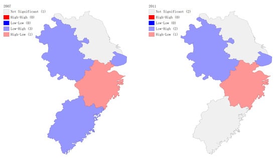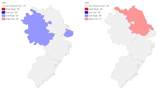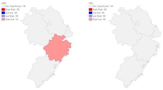 In terms of per capita carbon emissions, there were no significant high–high or low–low aggregations in the five regions between 2007 and 2021, except for a low–low aggregation observed in Jiangsu Province in 2020. In other years, a more consistent high–low aggregation was noted in Zhejiang Province, low–high aggregation in Shanghai Municipality, low–high aggregation in Anhui Province, and low–high aggregation in Fujian Province. This pattern aligns closely with the earlier analysis of the Moran’s I index. Zhejiang Province consistently exhibited a high–low aggregation, indicating its status as a hotspot region.