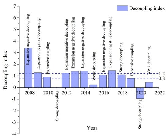 0, 0.8, and 1.2 are three particular elasticity values specified by Tapio’s decoupling theory, according to which a distinction can be made between the decoupling status of carbon emissions and economic growth. When the elasticity coefficient is greater than 1.2, the carbon emissions are expansion negative decoupling or recession decoupling. When the elasticity coefficient is less than 0, the carbon emissions are negative decoupling or strong decoupling.