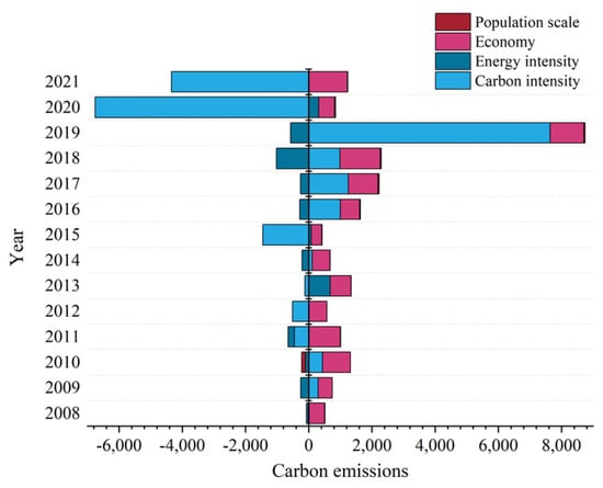 As shown in Figure 17, in Anhui, the impact of carbon intensity exhibits significant variability. Unlike Jiangsu and Fujian provinces, where the promoting effect is more pronounced, Anhui Province shows a mixed trend, with seven years demonstrating a promoting effect and the remaining seven years showing a restraining effect. The overall impact of energy intensity on construction-related carbon emissions in Anhui Province tends to be inhibitory. The driving factor value of energy intensity shows a decreasing trend during the research period, indicating an overall improvement in energy consumption efficiency. The economy consistently plays a driving role in carbon emissions. Especially in recent years, its driving effect on the growth exceeds 10 million tons annually. The per capita construction GDP in Anhui Province has continued to increase over the years, reflecting a trend of rapid development. The inevitable choice is to follow the path of green and efficient development. Regarding population scale, it generally drives construction-related carbon emissions, except for the years 2008–2010, where a restraining effect is observed. However, the fluctuations in population inflow and outflow in Anhui Province are not substantial, resulting in a relatively weak impact on construction-related carbon emissions.