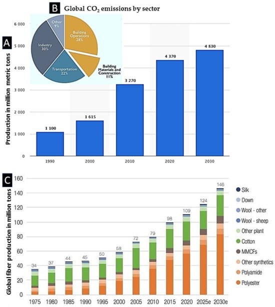 (A) Graph showing the cement production 1990–2030 (https://www.globalefficiencyintel.com/new-blog/tag/carbon+capture, accessed on 6 February 2017), (B) Graph showing the global CO2 emission by sector https://nickelinstitute.org/blog/2020/april/functional-facades-help-tackle-building-emissions/, accessed on 21 April 2020, (C) graph showing the textile fiber production 1975–2030 (https://www.textiletoday.com.bd/demand-for-preferred-fibers-growing-rapidly/, accessed on 23 August 2021).