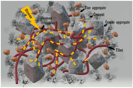Fibers can act as stress transfer elements within a concrete element by transferring the load from one part of the structure to another. This improved load distribution often minimizes localized stress concentrations, thus reducing the risk of premature failure [90]. The incorporation of textile fibers in concrete can also have a positive effect on both the flexural and impact strength. The reinforcement effect of fibrous components improves the material’s ability to resist bending forces, thus increasing its flexural strength and preventing premature structural failure. Therefore, this improved flexural strength makes concrete suitable for applications that require a higher load-bearing capacity and enhanced structural performance. Concrete structures often experience impact loads, and the addition of fibers can enhance their impact resistance in such instances. This is depicted in Figure 2. Fibers, once dispersed throughout the concrete matrix, can absorb and dissipate the energy from impacts, thus reducing the formation and propagation of cracks. This improvement in impact resistance is particularly valuable in applications where dynamic or sudden loading is expected, such as industrial floors, pavements, and earthquake-resistant structures.