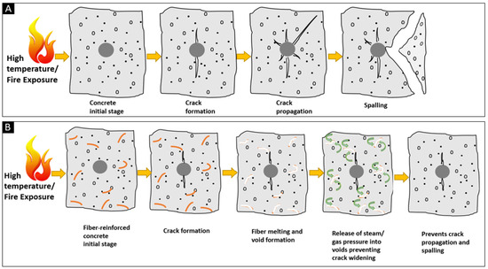 Spalling refers to the chipping, flaking, or breaking of the surface layer of concrete or other materials [101]. It typically occurs when the surface of the material deteriorates and separates from the underlying layers, resulting in the flaking of small pieces of the material. Generally, spalling occurs when concrete undergoes surface cracking and flaking, owing to exposure to a high temperature, such as in a fire scenario. In the case of a concrete structure, spalling can also happen due to various other factors, including freeze–thaw cycles, chemical attacks, reinforcement corrosion, structural overload, or due to physical impact. It is to be noted here that, when water infiltrates the pores of concrete and subsequently undergoes freezing, it expands. This expansion can exert pressure on the concrete structure and result in cracking and spalling in due course. Exposure to certain chemicals, such as de-icing salts, acid rain, or aggressive substances, can also cause the deterioration of the concrete surface. The chemical reactions or erosion caused by these substances tend to weaken the concrete and, thus, can lead to spalling. If the reinforcing element, steel, within the concrete starts to corrode, the resulting rust occupies a greater volume than the steel, resulting in the surrounding concrete cracking and spalling. This commonly occurs in structures where the steel reinforcement has been exposed to moisture or chloride ions. Excessive loads or impact forces on the concrete surface can also cause localized stress and lead to spalling, particularly if the concrete is not adequately designed or reinforced to handle such loads. Spalling is a significant concern, as it often compromises the structural integrity and durability of concrete structures. It can also result in the exposure of underlying layers, thus leading to further damage, and can lead to additional problems if not addressed properly. The addition of fibers to concrete can have a positive effect on the thermal resistance and spalling behaviour of the material, particularly in situations involving high temperatures or fire exposure. Fibers act as a thermal barrier by reducing the heat transfer within the material. They help to obstruct the movement of heat through the concrete matrix by creating a network of thermal bridges, which leads to improved insulation properties. As a result, the addition of fibers can help to reduce the rate of heat transfer and improve the overall thermal performance of concrete structures. It can also enhance the spalling resistance of the concrete by providing reinforcement and limiting crack propagation. Fibers help to bridge cracks that may form due to thermal expansion, thereby reducing the risk of spalling. The reinforcement effect of fibers helps to maintain the integrity of the concrete, preventing the rapid development of surface cracks and the subsequent spalling of the material. Furthermore, certain types of fibers, such as polypropylene or steel fibers, can undergo phase changes or melting during fire exposure. Steel fibers have a melting point of ~1500 °C, while polypropylene fibers melt at lower temperatures of around 165 °C. In typical building fires, temperatures can range from 530–1093 °C or higher. According to their melting temperature, these fibers create voids or channels within the concrete matrix, allowing for the release of steam or gas generated due to the high temperatures. This release of pressure helps to minimize the build-up of internal stresses and reduces the likelihood of spalling. A schematic diagram representing the spalling prevention mechanism in fiber-reinforced concrete is shown in Figure 4.