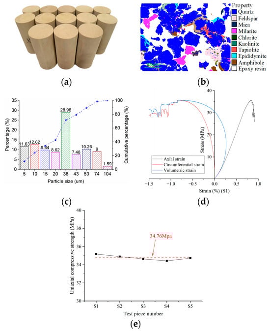 Basic physical and mechanical characteristics of the siltstone. (a) Siltstone sample specimens; (b) Mineral composition; (c) Particle size distribution; (d) Results of representative stress–strain curve; (e) Uniaxial compression strength test.