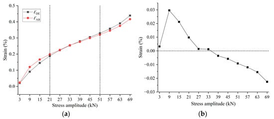 Relationship between the loading deformation and stress amplitude. (a) εAB and εDE; (b) εAB-εDE.