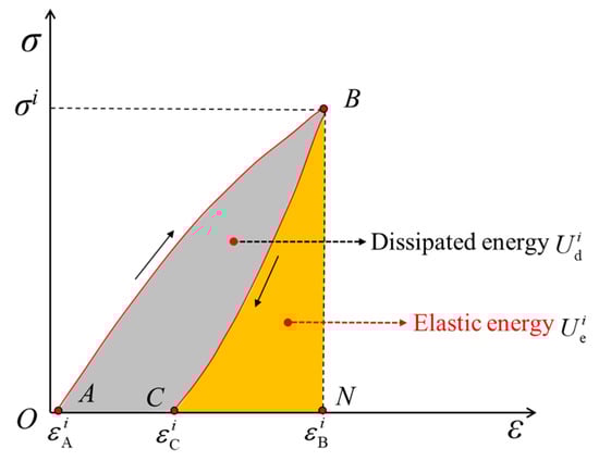 As shown in Figure 11, according to the law of energy conservation, assuming there is no heat exchange during the loading and unloading process of the rock, the total energy density of the i-th cycle during the loading and unloading process can be divided into elastic energy density and dissipation energy density , as follows: