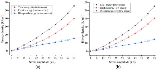 As shown in Figure 16, the energy density of rock samples at different amplitudes is calculated using the division method illustrated in Figure 15. The deformation recovery mechanism during two unloading cycles in Figure 6 demonstrated that rapid unloading results in significant stress changes within a short period of time, making it difficult for microcracks to return to their initial state and causing numerous microcracks to remain closed. By contrast, slow unloading allows microcracks more time to gradually recover and increases their likelihood of returning to their initial state. As a result, the plastic energy consumption during slow unloading is lower than that during instantaneous unloading. However, slow unloading also involves more energy dissipation due to relative friction between rock particle slippage and cracks. Therefore, after the compaction stage (when the stress amplitude exceeds 21 kN), the damage energy consumption during slow unloading becomes greater than that during instantaneous unloading.