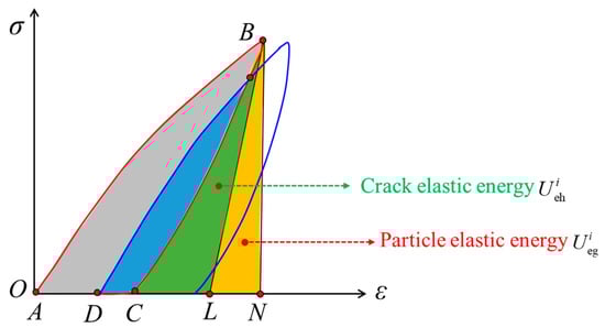 On this basis, the energy in a cycle of loading and unloading can be divided into the following three parts, as shown in Equations (4) and (5): damage energy consumption caused by rock particle slippage and particle structure fracture; particle elastic energy stored by the compression deformation of rock particles; and crack energy stored by microcrack compression and closure. The crack energy is divided into two parts. One part is released as the crack opens during unloading, which is manifested as crack elastic energy . The other part is not released and is stored inside the rock, which is manifested as plastic energy dissipation .