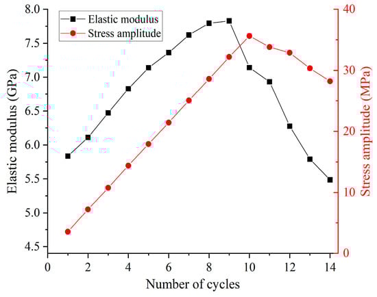 The elastic modulus calculated for each cyclic loading in Figure 18 is presented in Figure 20. Before reaching the peak strength, as the stress amplitude increases, the elastic modulus of the siltstone increases. As a result, it is not feasible to calculate the damage of the rock samples during loading based on the elastic modulus degradation method described in Equation (6), as it may result in “negative damage”.