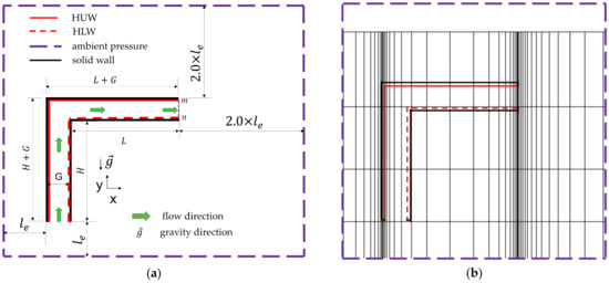 - A uniform heat flux, I, of was applied on either side of the air cavity in two cases, namely in heating the upper and lower walls, as displayed in Figure 1a to represent two cases of the absorbing surface of the chimney. A chimney with opaque upper walls absorbs solar radiation on the upper walls. Accordingly, the upper walls are heated by solar radiation. The absorbed heat is then transferred to the air in the cavity from the inner surfaces of the upper walls. Therefore, this case is named “heating the upper walls (HUW)”. On the other hand, with transparent upper walls such as glass-plate walls, solar radiation is transmitted through the upper walls, heats the lower surfaces, and then is transferred to the air in the cavity. Consequently, this case is named “heating the lower walls (HLW)”. With the dimensions denoted in Figure 1a, the heating length of the upper and lower surfaces are and , respectively.