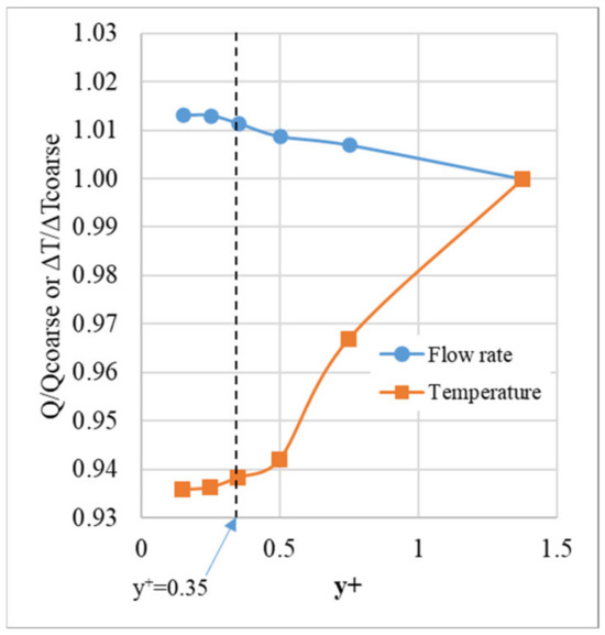 The mesh density and the extension were also carefully evaluated. First, an extension = was applied. The mesh density was then increased gradually by increasing the number of cells as well as changing the growth rate of the cell sizes from the solid surfaces. Accordingly, the value also decreased gradually. Figure 2 shows the variations in the flow rate and temperature rise versus for the case of L = H = 0.5 m and G = 0.05 m. Q and were compared to those of the coarse-mesh case, which had a value of 1.375. As seen in Figure 2, Q and converged as decreased. Particularly, the variation in Q and was within 0.5% when became less than 0.35, which had 40 cells in G and 50 cells in L or H. This result agrees with those reported in previous reports [6,25].