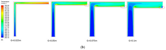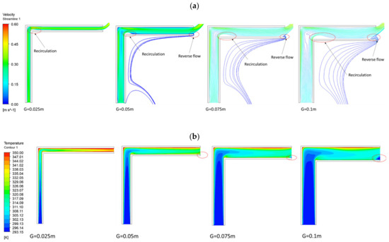 Figure 5 demonstrates different cases of L ( and G = 0.1 m). The velocity and thermal boundary layers are observed on both walls of the channel. Figure 5a shows a decrease in the flow velocity as L increases and H decreases accordingly due to the fixed . In contrast, the temperature on the L portion of the combined chimney is much higher and increases with L. There occurs a recirculation zone downstream of the bend in the combined chimney, which has also been reported in vertical solar chimneys with a horizontal inlet [24,25]. Particularly, a reverse flow appears at all L values in Figure 5a and brings air at an ambient temperature into the air channel near the outlet (Figure 5b, L = 0.5 m). In Figure 5a, the reverse flow is detached from the recirculation at L = 0.25 m and 0.5 m, but they combine at L = 0.125 m. Such a combination was also demonstrated by Zamora and Kaiser [25] at = 0.175.
