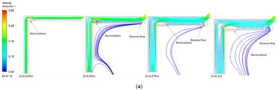 In addition, the length of the reverse flow, , which is the horizontal distance from the outlet to the last streamline of the reverse flow, was also examined. changed from 0.158 m in Figure 3a (no extension) to 0.142 m in Figure 3b (5.0 G extension). However, increasing from 5.0 G to 10.0 G (Figure 3c) resulted in a similar of 0.14 m. Therefore, was selected and employed hereafter.