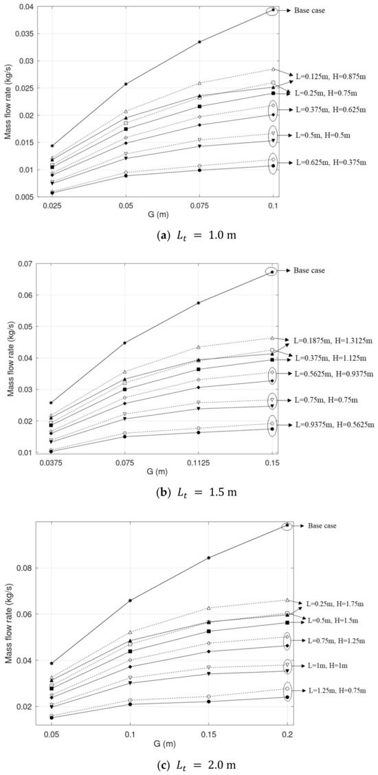Figure 9 shows the flow rates obtained with both the base and combined solar chimneys. The flow rate is plotted as a function of G, L, and the heating location.