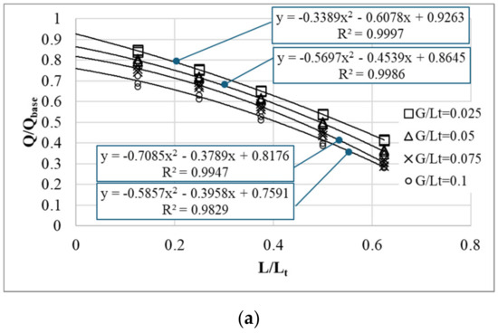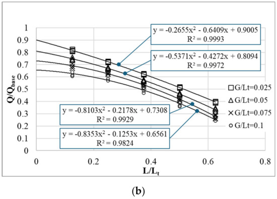 For the combined chimney, increasing L results in lower values for both the flow rate and the rate of its increase, as shown in Figure 9 and Figure 10. According to the literature, the three main factors causing this reduction consist of (i) the reduction in the stack height as L increases [18], (ii) the pressure loss associated with the bend, particularly the recirculation downstream of the bend, and (iii) the reverse flow at the outlet, as seen in Figure 5, Figure 6 and Figure 7 [6,21,25]. To estimate the effect of the bend, the data in Figure 8 were replotted as a function of and . Furthermore, they were also fitted with quadratic polynomials, which have good values of , as seen in Figure 11. As , the effects of the stack height reduction and those of the reverse flow vanish; thus, there remains the sole effect of the bend. Applying to the regression equations in Figure 11 offers the corresponding , as seen in Table 5.