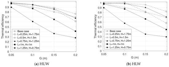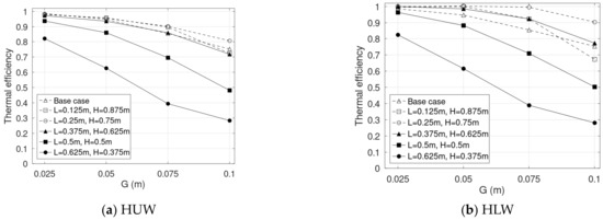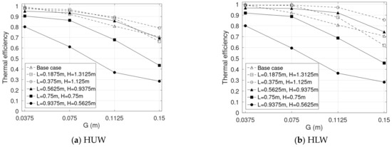 Third, the thermal efficiency decreases as G, L, and increase. The highest is obtained at = 0.25, while of the base case is similar to that of = 0.375. Between the heating cases, HLW shows a higher thermal efficiency. The reverse flow plays a crucial role in the reduction in thermal efficiency.