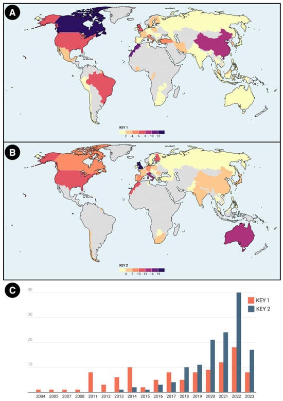 A descending order search was carried out to research mining waste management, and recycling/valorization/reuse of mining waste in concrete. For this purpose, the authors selected a sample of more general topics, then carried out more specific searches on that sample until identifying representative papers. Firstly, the research was performed based on the parameters <Title–Abstract–Keywords> “recycling, OR reuse, OR valorization, AND mine AND waste, OR tailings, AND concrete” to cover all the papers related to the recycling of mining waste in concrete technology. The selected sample period was between 2002 and 2023. The final sample covered 106 papers including reviews and articles. To analyze papers on the management of mining waste and circular economy, a second search was performed based on the same parameters <Title–Abstract–Keywords> “mine AND waste AND reuse OR valorization OR recycling AND circular AND economy”. The result was a sample of 134 published articles from 2013 to 2023. In terms of studies from 2002 to 2022, researchers have been more interested in this subject in the last 6 years, surpassing the limit of 100 published papers. The distribution of published papers by year and country/territory is presented in
