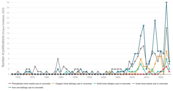 Also, the metric analysis of the literature based on Scopus data shows multiple works dealing with the recycling of various mine waste types in the concrete industry that are plotted according to the year of publication in