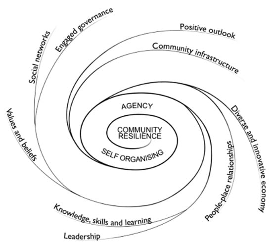 There is a shared understanding that ‘resilience building can be accomplished by actively developing and engaging the capacity to thrive in an environment characterized by change’ [,]. It is interesting to observe also that community resilience can be reinforced by the presence of disruption more than by its absence. Khanlou and Wray [] suggest that adversity itself may have a positive outcome in strengthening and building resilience, triggering purposefulness, connectedness, or even joy. Some aspects of well-being, such as a stronger sense of community, could be positively affected by the collective experience of hardship []. Pelling [] holds that social resilience is ‘a product of the degree of planned preparation undertaken in the light of a potential hazard’. Social actors need to develop their anticipatory capacities and pre-hazard preparedness to learn from adverse events. Glavovic et al. [] push preparedness further, writing that social resilience is ‘influenced by […] institutions […] and networks that enable people to access resources, learn from experiences and develop constructive ways of dealing with common problems’.