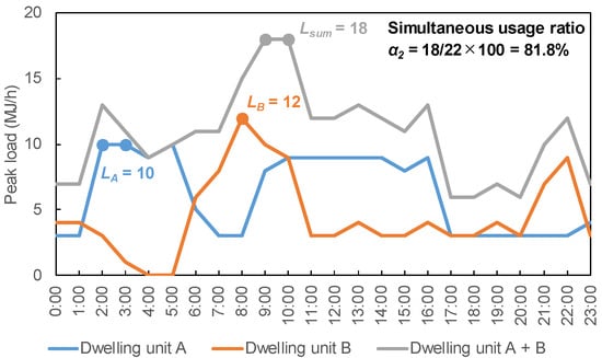 Figure 1 shows an example of calculating the simultaneous usage ratio using load data for two dwelling units. If the peak load of dwelling unit A is 10 MJ/h, B is 12 MJ/h, and that of two dwelling units that actually occur is 18 MJ/h, the simultaneous usage ratio is 81.8% (=18/(10 + 12) × 100%). When comparing two dwelling units, the ratio may be around 80%, as shown in the example, or it may reach 100% simultaneously. However, as the number of dwelling units increases from 10 to 20 to 30, it becomes less common for all dwelling units to peak simultaneously, resulting in a decline in the ratio.