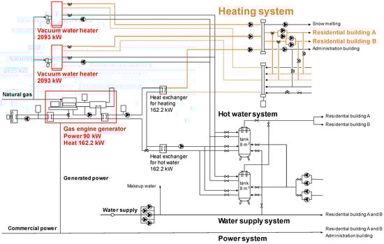 Figure 2 displays the heat and power supply system, which includes a central heat source system for heating, hot-water supply, and snow melting. The system comprises a cogeneration system (CGS) that utilizes one gas engine generator and two vacuum water heaters (heater) to produce hot water at 80 °C for heating. During the planning stage, the annual load for the heating that is the focus of this study was determined to be 4600 GJ/year. The combined heat and power (CHP) system is operated following electric load and is automatically controlled in response to power demand.