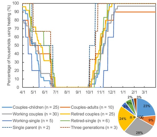 Figure 4 shows the heating periods for each household composition. The study determined the start and end dates of heating usage and compared the proportion of dwelling units that used heating for each household composition. Single parent and three generation households began using heating in all their units in mid-October and continued to use it until May. In comparison, working–single households tended to discontinue the heating devices earlier and start using them later than other households.