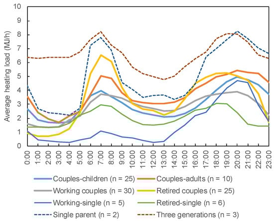 Figure 5 shows the average heating load for each time in January 2019. Many dwelling units for working–single households did not require heating from the morning until midday. Working households, including working couples and working singletons, had a peak in heating usage about an hour later than retired households, which included retired couples and retired singletons. Third generation households had a heavy load between midnight and 5 a.m., and heating was used continuously throughout the day.