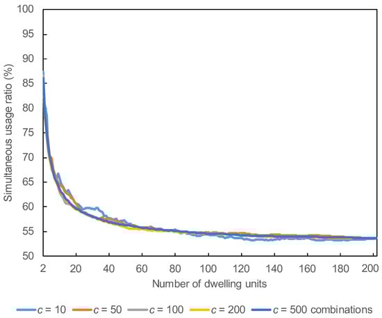 - A method for creating the curve of the simultaneous usage ratio was suggested, and it was confirmed that random sampling using c = 100 combinations had sufficient precision to avoid a combinatorial explosion. It was also found that the simultaneous usage ratio was 53.6% and generally stabilized when the number of dwelling units exceeded 30 based on the curve of the ratio created for 204 dwelling units.