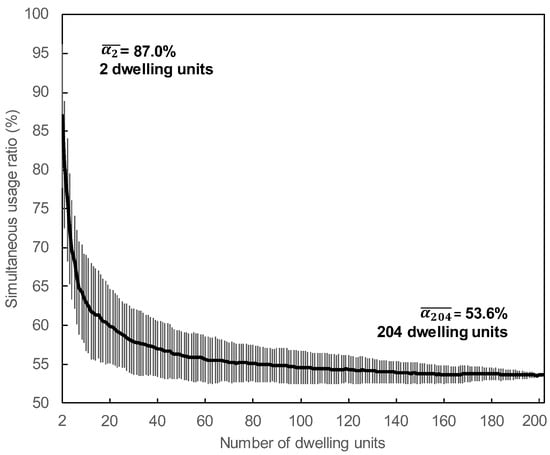 In this study, the simultaneous usage ratio means the ratio of the actual peak load for all dwelling units to the load that would occur if each dwelling unit peaked simultaneously. In general, as the number of dwelling units increases, the peak of each dwelling unit will be less likely to occur simultaneously, and the ratio will decrease. Therefore, it differs from the ratio of the number of zones or spaces, which are occupied or used at the time, to the total number of zones or spaces in the group, as defined in ISO 18523-1:2016 [].