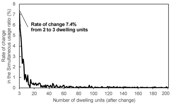 Figure 10 shows the rate of change in the simultaneous usage ratio for c = 100 combinations. The rate of change from two to three dwelling units was 7.2%. The rate of change approached 0% when the number of dwelling units exceeded 30 and then leveled off. This suggested that as the number of dwelling units in an apartment building increases, the simultaneous usage ratio decreases and generally stabilizes when the number of dwelling units exceeds 30. However, as shown in Figure 8, since the significant standard deviation was 4.3% for 30 dwelling units, it is necessary to consider the variation in the household composition of those living there. Therefore, to analyze the influence of occupant behavior according to household composition on the simultaneous usage ratio, the suggested method of creating the curve of the ratio will be used.