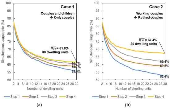 As a case study, the influence of changes in household composition on the simultaneous usage ratio was analyzed. Table 4 lists the cases of household composition. Case 1 illustrates the transition from couples and children to only couples as their children become independent over time. Case 2 also illustrates the transition from working couples to retired couples as they retire over time. Judging from the standard floor plans and sizes of current apartment buildings, it is not often that there will be a transition from couples and children to three generations. Furthermore, the National Institute of Population and Social Security Research [] released estimates showing that the average household number will become 1.99 in 2033 compared with 2.21 in 2020. The percentage of single-person households will also rise to 44.3% in 2050 from 38% in 2020. From these, the two case studies reflect changes in the general household composition in Japan.