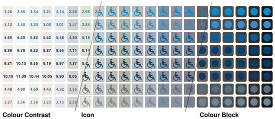 Signage design elements include shape, size, and layout, and practical design also considers cultural and regional differences, as well as design cognition [15,16,17]. In terms of colour, previous studies have shown that increasing the colour contrast ratio of icons is the most effective way to improve the universality of icons [18,19,20,21,22,23,24,25,26,27,28,29]. However, the colour design of icons also determines the visual aesthetics of the user interface (UI) to a large extent [30]. Therefore, when designing icon colours, designers’ over-pursuit of personalization and aesthetics often results in ignoring the usability of icons and the user experience. Furthermore, icon design is no longer limited to professional designers alone; students and non-professionals also have design needs. However, these individuals often lack sufficient professional knowledge and experience, making it challenging to consider concepts such as colour theory, visual perception, colour psychology, and universality [31,32]. They do not possess the necessary design cognition and struggle to make design decisions, making it difficult for them to engage in icon colour design systematically.