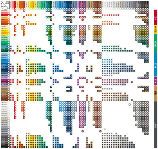 - Color Universal Design Recommendation Color Set Production Committee. Model Color Palette for Color Universal Design Guide Book, 2nd ed.; DIC Color Design Co., Ltd.: Tokyo, Japan, 2018. (In Japanese) [Google Scholar]