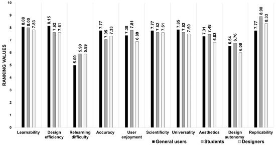In terms of the usability of Universal Colour, different user groups exhibited variations in their evaluations across various aspects (Figure 7). Overall, users from all groups rated aspects such as learnability, design efficiency, colour accuracy, scientificity, universality, and replicability relatively high. However, they provided relatively lower ratings for aspects such as relearning difficulty, aesthetics, and design autonomy. Among the user groups, general users scored the highest in terms of learnability, design efficiency, accuracy, scientificity, and universality. Student users rated user enjoyment, aesthetics, relearning difficulty, design autonomy, and replicability the highest. On the other hand, designer users scored the lowest in terms of learnability, user enjoyment, scientificity, universality, aesthetics, and design autonomy. Regarding the usability elements of Universal Colour, general users and students rated them higher, while designers rated them relatively lower.