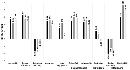 In the comparison of the usability ratings between Universal Colour and traditional methods, as indicated by the difference scores (Figure 8), Universal Colour outperformed traditional methods in most evaluation elements. Particularly, it received better scores in design efficiency, relearning difficulty, user enjoyment, and replicability. All user groups showed relatively small differences in ratings for learnability, design efficiency, and replicability, suggesting that these advantages were relatively consistent across groups. When examining the differences in ratings between Universal Colour and traditional methods across all user groups, it could be observed that general users and students rated Universal Colour higher.