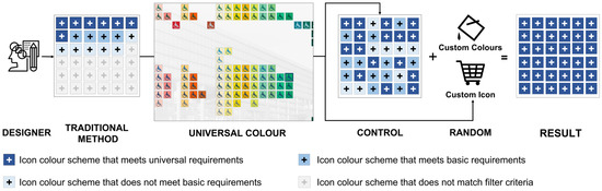 Universal Colour starts with a comprehensive presentation of icon colour schemes, which provides quantitative filtering and diverse presentation modes to assist designers in making more scientific and logical design decisions (Figure 6). By addressing the cognitive limitations and biases inherent in traditional design methods, Universal Colour offers designers a comprehensive display of all potential colour combinations, thereby mitigating the randomness in design cognition and decision-making. Additionally, it incorporates the W3C-recommended calculation method of a colour contrast ratio to filter solutions based on the universality of colour combination configurations, thereby addressing the constraints imposed by design requirements. The functionality of a custom colour input and a custom icon upload caters to the personalised needs of designers.