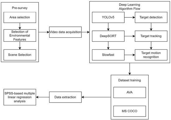 As shown in Figure 1, behavioral detection was performed using the You Only Look Once (Yolo) v5 model and the SlowFast algorithm. Actions, such as walking, standing, sitting, and social interactions, were tracked and counted using the Deep Simple Online and Realtime Tracking (DeepSORT) algorithm. Model training was performed using the audiovisual annotations (AVA) and Microsoft common objects in context (MS COCO) datasets. The number of people exhibiting four types of behaviors (walking, standing, sitting, and social interactions) was identified. A valid behavior lasted 120 consecutive frames. The four types of behaviors were extracted separately. Walking, standing, and sitting were mutually exclusive, and it was assumed that social interactions occurred at the same time as the other behaviors.
