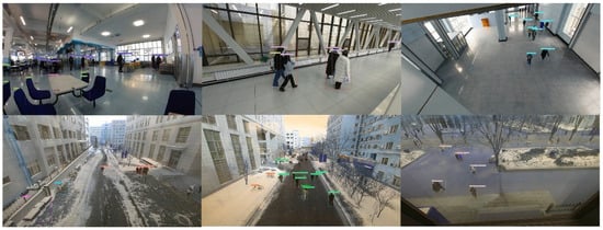 The behavioral patterns were analyzed using behavioral quantification, which has been widely used and proved effective [,,]. The video data were acquired by the author on the first campus of the Harbin Institute of Technology (HIT) from November to December 2023. Fifteen locations with high foot traffic were selected, including nine indoor scenes and six outdoor scenes. The video recordings were obtained from 10:00 to 14:00 on sunny days to obtain high-quality data.