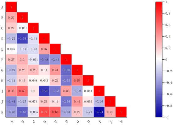 Correlation matrix plot (Pearson correlation). Notes: All correlations are significantly different from 0. A = proportion of people with social interactions; B = proportion of people walking; C = proportion of people standing; D = proportion of people sitting; E = indoors; F = with natural light; G = with stairs; H = with elevator; I = proportion of walking space; J = proportion of standing space; K = proportion of sitting space.