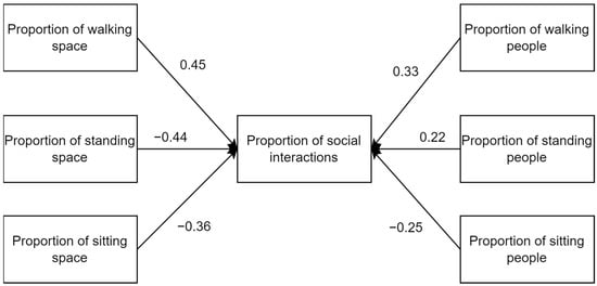 As shown in Figure 5, the findings indicate that environmental functional features significantly affect social interaction behaviors. A strong positive correlation was observed between the proportion of walking space and social interaction behaviors. A strong negative correlation occurred between the proportion of standing and sitting spaces and social interaction behaviors.