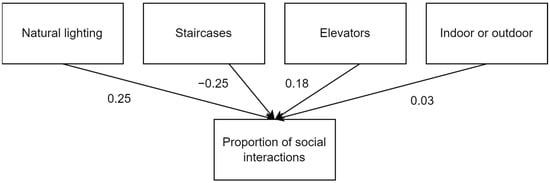 The proportion of people with social interactions was significantly and positively correlated with the proportion of people walking. A positive correlation occurred with the proportion of standing and sitting people, but the significance level was lower for the latter than the former. Figure 4 shows the correlations between the different variables. The results indicate that social interaction behaviors are correlated with the functional and physical characteristics of the environment. Different environmental characteristics had different degrees of impact on the social interaction behaviors of users of informal spaces on the cold-region university campus. The proportion of interacting people had a strong positive correlation with the proportion of walking space and a strong negative correlation with the proportion of standing and sitting spaces. In contrast, the effect of the physical characteristics of the environment was relatively small. The presence/absence of an elevator, stairs, and natural lighting had small effects on social interaction, whereas the indoor/outdoor variable had no effect.
