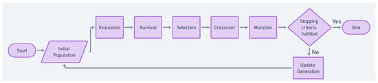 English naturalist Charles Darwin transformed our understanding of life through his exploration and the concept of natural selection in his famous book, “On the Origin of Species”. He introduced natural selection as a metric for the resilience of species/organisms to adapt to changes in their environment and evolve accordingly [44]. In evolutionary theory, traits are established by chromosomes, which consist of groups of units called genes. The genes can pass on these traits to their offspring through a process referred to as crossover [45]. The algorithms that use these logics and mimic similar evolutionary processes are called Evolutionary Algorithms (EA). GA, which is a type of EA, starts by introducing an initial set of gene populations, identifying their objective fitness values, selecting the best genes and performing cross over and mutation, and generating a new population for the next generation [12]. In trivial terms, the process aims to keep the genes with the best fitness values and create new combinations from these best genes to generate even better solutions in successive generations. Figure 1 demonstrates the basic tenets of a simple GA.