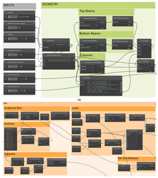 Performing structural analysis is an essential step for structural optimization workflow. Although it is not reliable, many scholars use their own program or third-party libraries for this step, as explained in the introduction section. In this study, an interaction has been established between Dynamo and RSA through the Structural Analysis for Dynamo (version 3.0.10) package, which enables the creation of geometry and the assignment of simulation criteria, such as supports, loads, and sections, based on the geometrical input in Dynamo. To create the analytical members, the lines created in the previous section need to relate to the “AnalyticalBar.ByLines” node from the mentioned Dynamo package. Once the bars have been created, sections and materials must be assigned to the created bars. Thereafter, supports, bar-end releases, and loads must be defined as illustrated in Figure 2b.