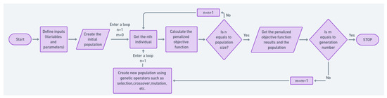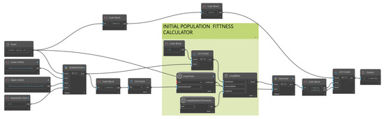 The parents that will create the succeeding generation of the population by GA operators are selected by using the obtained penalized objective function that results from the initial population and binary tournament selection. Individuals with smaller objective function values are selected as the parents while the other individuals are not selected, and their genes are eliminated. This process is repeated by the next generation creator node group shown in Figure 2c until a goal is met or a certain number of generations have been produced. The “LoopBodyVar1Literature” custom node contains two Python scripts and the same nodes from the initial population fitness calculator node group as illustrated in Figure 5. First Python code uses GA operators such as selection, crossover, mutation, etc. to create new populations. Second Python code, on the other hand, performs like another selection operator of GA and chooses the best combinations from parents and children.