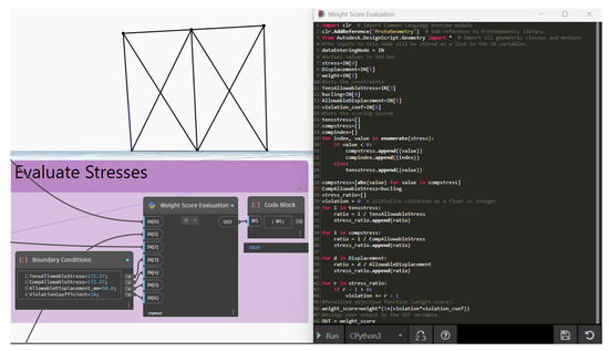 Dynamo drives the analysis process in RSA by using the “Analysis.CalculateWithSave” node. The information (analytical model, support and releases, and load cases) that has been created in the previous section needs to be connected to this node. This node performs the analysis and saves the model at a specified location (Figure 2b). Subsequently, stresses, weight of structure, and displacements are needed for the calculation of the penalized objective function. To obtain the maximal stress for each bar, the “BarStress.GetMaxValuesList” node is utilized. For maximal values of displacement on the joints, the “BarDisplacement.GetMaxValuesList” node is utilized. The last parameter that needs to be obtained for the weight score is the “selfweight” value of the structure. This can be achieved by using the “NodeReactions.GetValues” node and extracting the “FZ” results for the load case labeled as “Selfweight”. Evaluating the penalized objective function of each design option is crucial for ranking the fitness of designs in structural optimization. That is why the last part of the script evaluates penalized objective functions by considering constraints as explained in detail in the background section. This process is implemented in the VP environment with the help of Python script as presented in Figure 4.