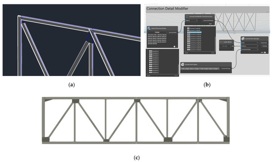 (a) Truss model after importation into Revit; (b) nodes for adding the connection details through Dynamo; (c) the structure after adding the connection details.
