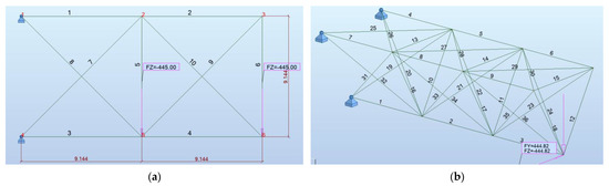 The 10-bar truss example is a standardized test case in the field of structural optimization for those who want to evaluate and validate the effectiveness of proposed optimization techniques, and it is frequently used as a benchmark problem by researchers [12,14,53,54]. The geometry, support requirements, material properties, and boundary conditions for this 2D-hanging truss, which is shown in Figure 7a, have been adopted from the referenced study [12]. A discrete list that contains 41 cross-sectional areas has been sourced from the American Institute of Steel Construction (AISC) and imported to RSA from the AISC database (AISC Edition 15.0 American hot rolled shapes). The HSRO (Hollow Structural Round Sections) family was used during the optimization. Detailed information about importing databases and using different section properties can be found on the referenced website [55]. Population size and generation number have both been determined as 20 through the execution of ten distinct run cycles for this example.