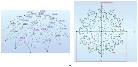 The 120-bar dome truss problem was first solved by M.P. Saka in 1991 [52]. Thereafter, other researchers have employed this structure to test their algorithms [52,57,58,59,60,61]. The configuration, dimensions, support requirements, material properties, loading, and boundary conditions of this dome, which is illustrated in Figure 7c, are sourced from the referenced article [52]. The elasticity module is taken as 210000 MPa and material density is taken as 7860 kg/m3. A total of 27 CHS (Circular Hollow Section) sections that comply with the provided limits were chosen from the UKST (British hot rolled section) database available on RSA [55]. Moreover, the buckling effect for elements under compression has also been taken into consideration. To calculate the critical load for buckling, a Python code was created with the formulations taken from AISC [62] regulations. Population size and generation number have both been determined as 20 through the execution of ten distinct run cycles for this example.