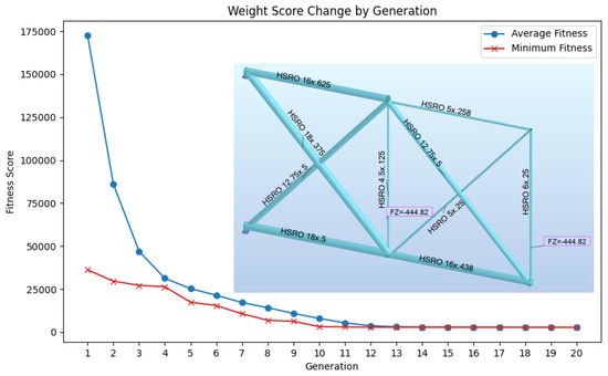 The results found for the 10-bar truss are shown and compared with those from studies taken from the literature in Table 1. This table reveals that the weight obtained after optimization is higher than the solutions obtained from previous studies. However, as the aim of this study is to demonstrate the usability of the proposed methodology, the solution obtained is acceptable because this study, conducted by Camp et al., required an average of approximately 10,000 truss analyses with 24 separate run cycles [53] to converge the solution, exhibiting a magnification of 62.5 times compared to the analysis number that has been performed for this study. On the other hand, Jafari et al. [23] needed 113.25 times more analyses to obtain the result presented in Table 1. In addition to the table, the weight score change chart and the final version of optimized structure with sections found have been presented in Figure 8.