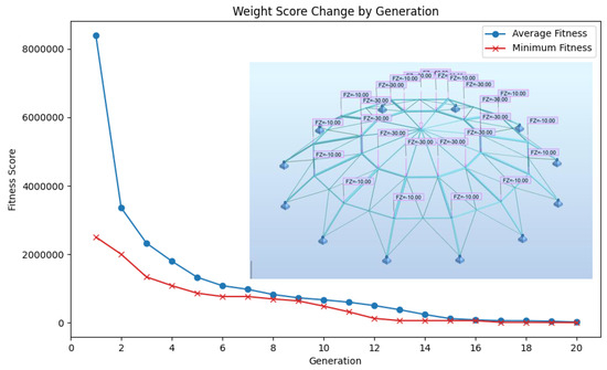 This example aims to find suitable sections that give minimum weight while satisfying given constraints for 120 elements that are divided into 7 groups from the list that contains 27 different cross-sectional areas. Results for the 120-bar dome truss are presented in Table 3 along with their comparison to literature results. It is worth noting that conducting additional runs and increasing the number of analyses for the same study is expected to yield better weights, as the study [61] needed 84,000 overall analyses and the study [58], required 100 separate run cycles to find the results depicted in Table 3. It is also important to mention that in this study [61] the displacement constraints are taken as having a ±5 mm difference to the referenced study [52], resulting in a higher structure weight. Also. the referenced studies all used continuous design variables whereas discrete sets were utilized in this manuscript. The reason for choosing this problem for the Results section is to demonstrate that the proposed algorithm is effective and performs well as the number of elements increases. The results indicate that the proposed methodology can be applied to complex structures in future studies. Nevertheless, it should be noted that conducting one analysis for a problem of this scale took about 50 s. Lastly, Figure 10 presents the optimized structure along with a weight score change by generation chart.