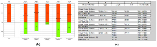 This section of this study report provides LCA and cost analysis results of the optimized 120-bar dome truss structure obtained using the explained methodology. As the first step, the best model after optimization has been imported into Revit from Dynamo using the “Revit importer” custom node. Once the model is ready in Revit, as shown in Figure 11a, LCA analysis can be performed by using “Tally”. After the analysis, a detailed report is generated, which includes information on factors such as global warming potential, acidification, and smog formation potential, some part of which is demonstrated in Figure 11b. For cost analysis, a bill-of-quantity table has been created on Revit, as shown in Figure 11c. Fields in this table can be adjusted by specific needs. To give an example, unit prices have been obtained from the referenced website [63] and the total cost of the structure has been calculated automatically within the table.